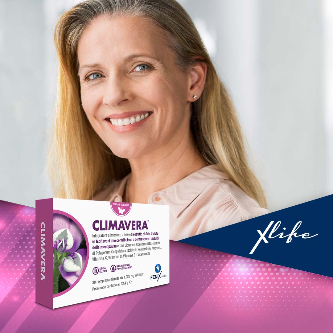 Contenuti medi per 1 compressa di Climavera Integratore: Soia e.s. 200 mg di cui isoflavoni 80 mg, Licopene 0.25 mg, Coenzima Q10 20 mg, Polygonum cuspidatum e.s. 20 mg di cui Resveratrolo 19.6 mg, Vitamina D3 10 mcg, Vitamina C 80 mg, Vitamina E 36 mg, Magnesio 112.5 mg, Vitamina K2 105 mcg.